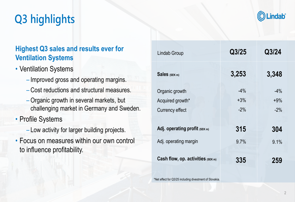 Lindab Q3 2025 slides: Ventilation Systems hits record results despite market challenges